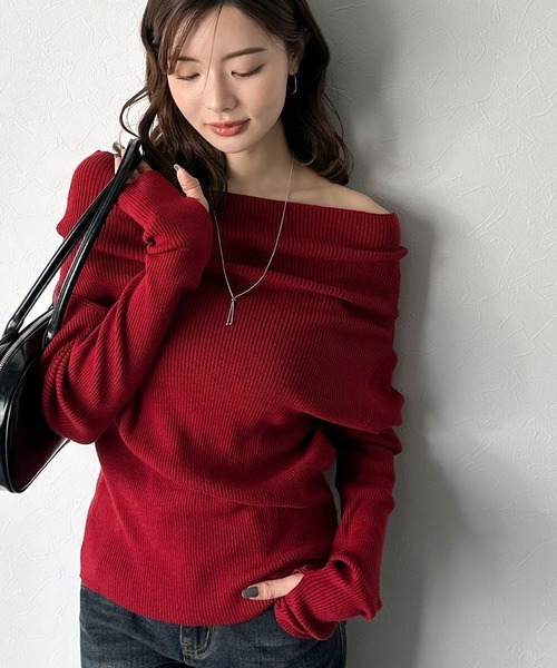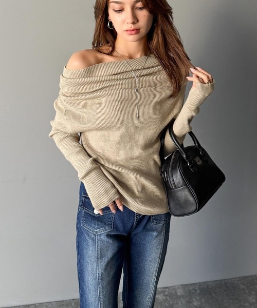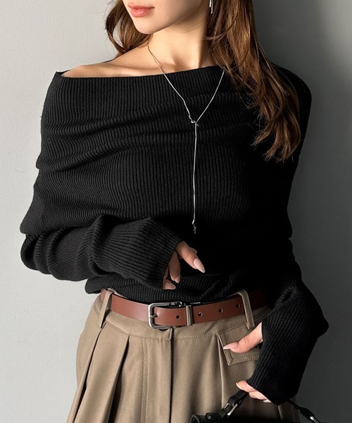 日本🇯🇵連線 Mily Bilet 垂墜露肩羅紋針織上衣 平口 露肩 單肩 長袖 垂墜設計 羅紋針織 5色(任買兩件711免運)/預購