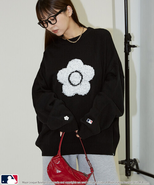 日本🇯🇵連線 MLB x MARY QUANT 正面雛菊&amp;背面隊徽刺繡提花針織衫 隊徽 刺繡 休閒 毛衣 針織衫 長袖 寬鬆 3款(任買兩件711免運)/預購