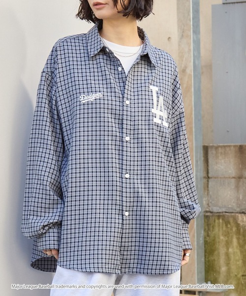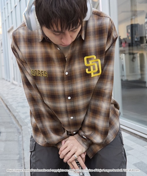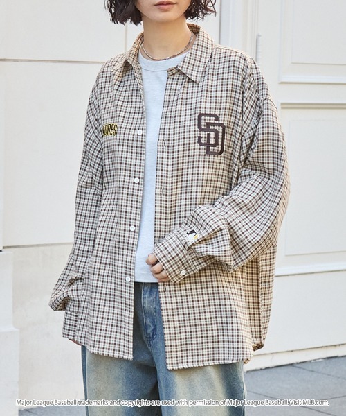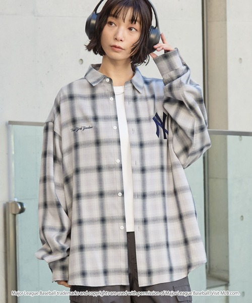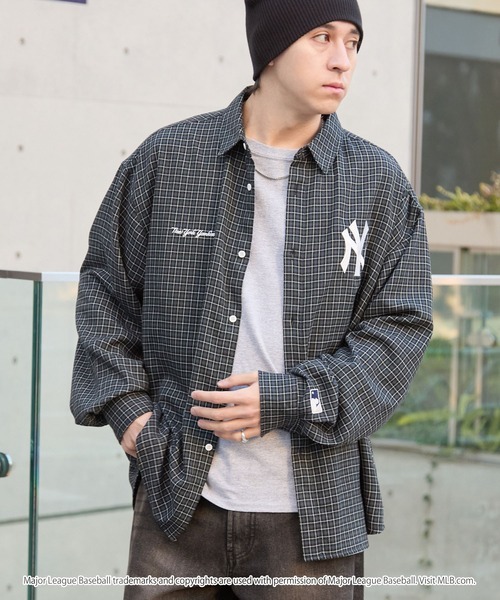 日本🇯🇵連線 MONO-MART x MLB 大LOGO隊徽刺繡長袖格紋襯衫 隊徽 刺繡 長袖 寬鬆 落肩 襯衫 外搭 6款(任買兩件711免運)/預購