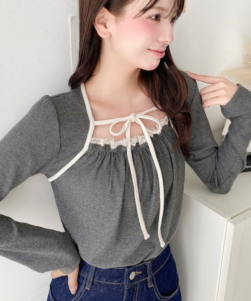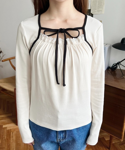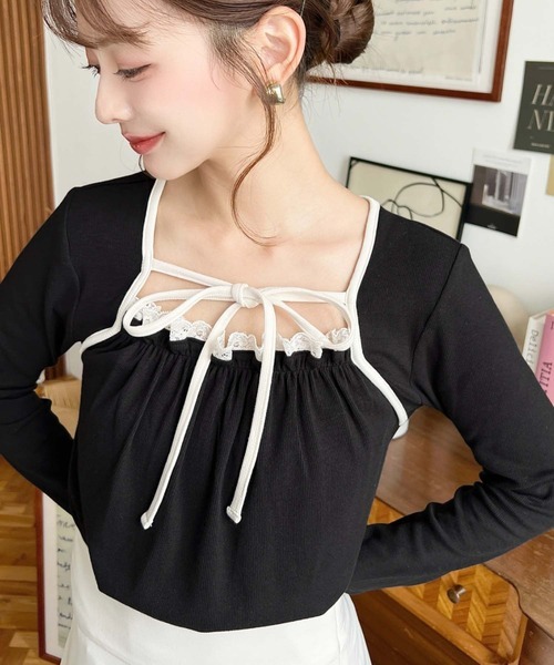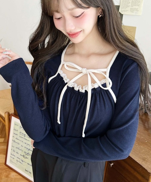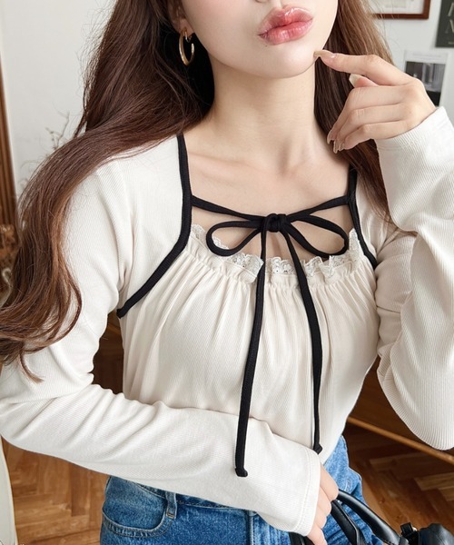 日本🇯🇵連線 Moment+ 甜美分層緞帶羅紋長袖上衣 假兩件 綁帶 緞帶 羅紋材質 長袖 5色(任買兩件711免運)/預購